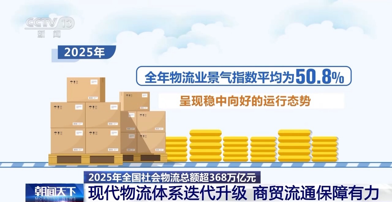 中国物流与采购联合会今天公布:2025年全国社会物流总额超368万亿元。2025年,现代物流体系持......