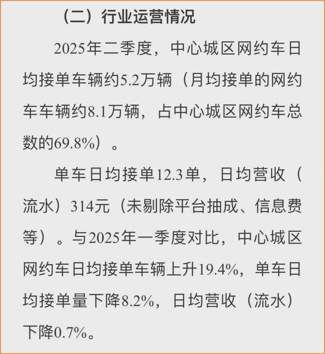 重庆中心城区一共有11.6万辆有证的网约车,二季度中心城区网约车日均接单车辆约5.2万辆(月均接单的网约车车辆约8.1万辆,占中心城区网约车总数的69.8%)。
