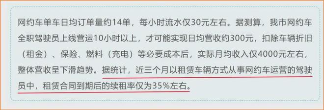 8月28日,珠海市交通运输局发布网约车行业风险提示,近三个月以租赁车辆方式从事网约车运营的驾驶员中,租赁合同到期后的续租率仅为35%左右。也就是说,65%的网约车司机不再续租。